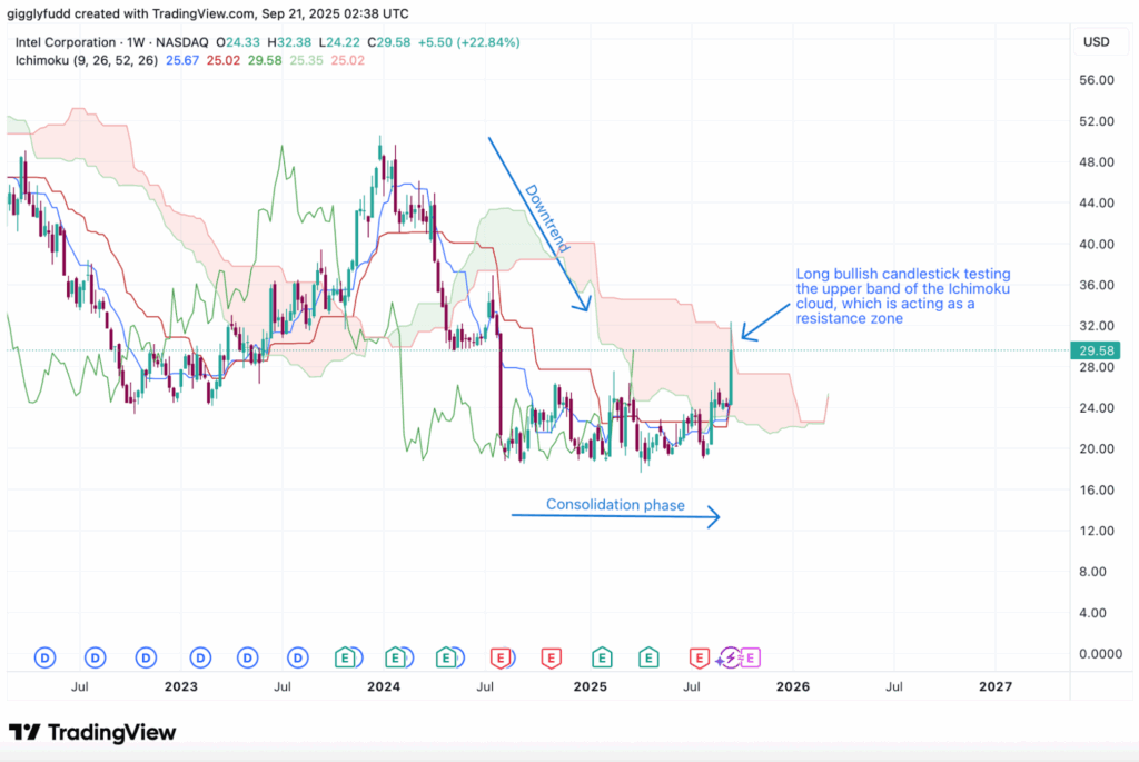 On the daily chart, Intel’s price has broken out strongly, surging to 32 and moving beyond the 26 level that marked the upper boundary of its recent consolidation phase. The future Ichimoku cloud is turning bullish, signaling momentum may continue to the upside. However, candlesticks are currently trading well above the cloud, which now acts as a strong support zone, suggesting that while the broader trend remains positive, the stretched distance from support could invite a near-term pullback before any further sustained rally.
