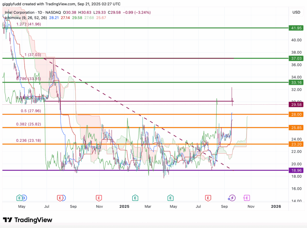 Intel’s core business remains under pressure, with its foundry still losing money and product timelines not clearly defined. Despite this, sentiment has turned positive as investors view the Nvidia partnership as a possible turning point and the government stake as added long-term support. On the charts, the stock has jumped into the $30 range, breaking through major resistance. Still, many analysts warn that a pullback is likely as traders take profits and the initial excitement fades.